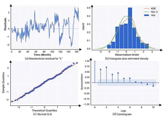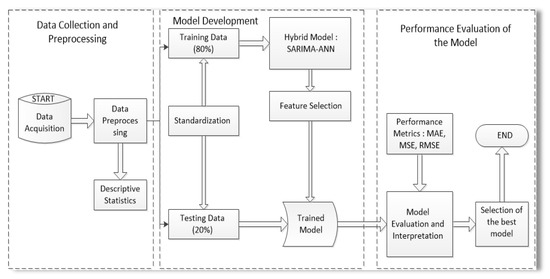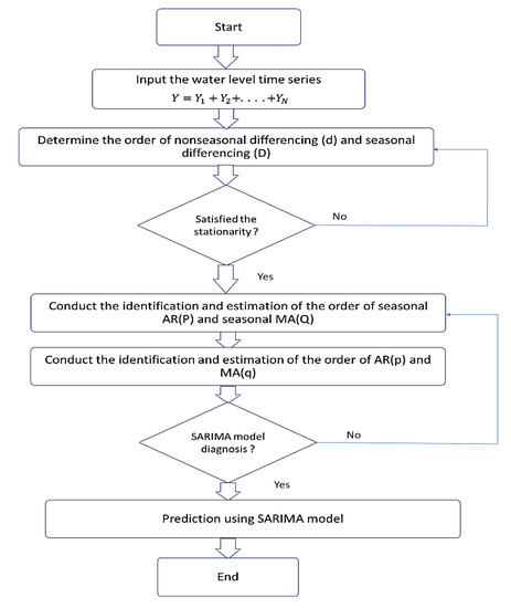 The mean, variance, and autocorrelation functions of the data were tested for stationarity with respect to time as a prerequisite for using the SARIMA model. (random error) was also made independent and distributed similarly to a standard zero-mean dispersion. Higher weights were regarded as indicators of a better prediction model when the SARIMA model was tested for weights [47,48]. After the selection of weights, the SARIMA model was modelled in four stages including: (i) stationarity check; (ii) identification and estimation stage; (iii) diagnosis stage; and (iv) prediction stage. In stage one, the time series data were checked for stationarity. The stationarity of data was checked followed by the Augmented Dickey Fuller (ADF) test, which examines a time series for the null hypothesis of the existence of a unit root [49]. ADF’s mathematical expression is as follows: