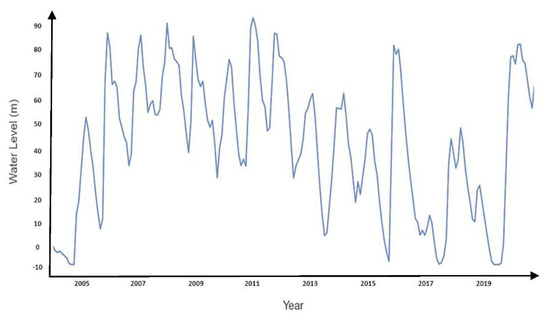 The daily RWL data for the RHR were collected from Chennai Water Management for the period from January 2004 to November 2020 [41]. The daily data was converted to average monthly data, which were used for developing and testing the models in the current study. The monthly average RWL for the RHR is shown in Figure 3. As can be seen from the figure, the highest amount of RWL was nearly 32 million ft3 in January 2011, whereas the lowest amount was found to be 0 in September 2004.
