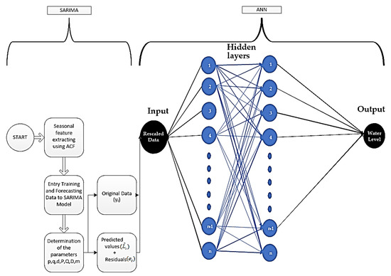 In order to forecast RWL, the hybridization of SARIMA and ANN was performed to the dataset. Figure 1 visualizes the overall framework of the study. The approach was carried out in three phases. First, the difference’s requirement was identified, a stationarity test was conducted for this reason. By differencing the data, it was made stationary, and the parameters of SARIMA were identified using autocorrelation function (ACF) and partial autocorrelation function (PACF) plots.