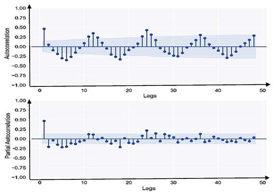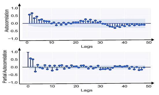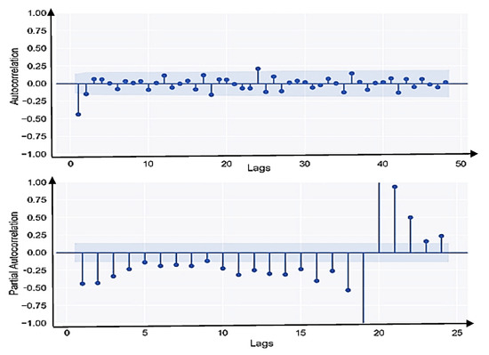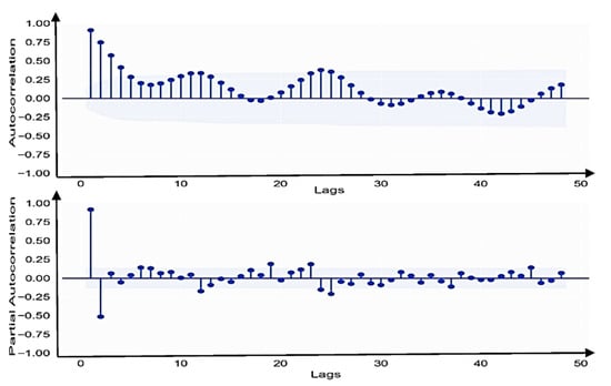 where is constant, is time trend coefficient, lag order, and is the error term. Before executing the test for the null hypothesis , the appropriate lags of order were selected. If the time series is non-stationary, stationarity can be obtained by regressing or differencing the data until it becomes stationary [50]. Non-seasonal and seasonal differencing are the two types of differencing with order . Seasonal difference is a technique for removing seasonal components from data and by eliminating trend characteristics from the data, the non-seasonal difference aims to address data instability [51]. This can be achieved by determining the order of the SARIMA model, estimating unknown parameters, accumulating model candidates with a p-value of less than 0.05, and evaluating the goodness of fit on the anticipated errors; then, predicting a value in the future using the data that is available. To establish the ordering of the SARIMA, ACF and PACF charts were required [52].