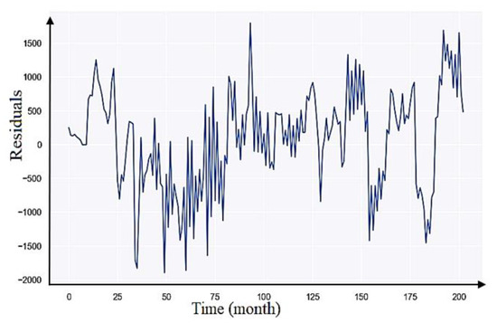 where represents the linear element and indicates the nonlinear component, these two factors must be calculated based on the data. At first, the SARIMA model was employed as the linear module, and then the linear model’s residual was determined from the model. Let stand for the linear model’s residual at time , then:
