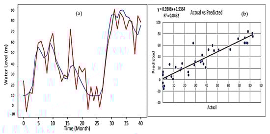 The outcomes of the SARIMA, ANN, and SARIMA–ANN hybrid models were monthly RWL of Red Hills Reservoir for the January 2004–November 2020 period. The predicted values obtained by the models were compared with the actual dataset. Several statistical performance indicators, including RMSE, MAE, MAPE, and (Equations (23)–(26)) were used to evaluate the performance of each model. A lower value of MAE, RMSE, and MAPE indicate a good correlation between the observed and predicted datasets. The value of closer to 1 demonstrates a good correlation between the observed and predicted data sets: