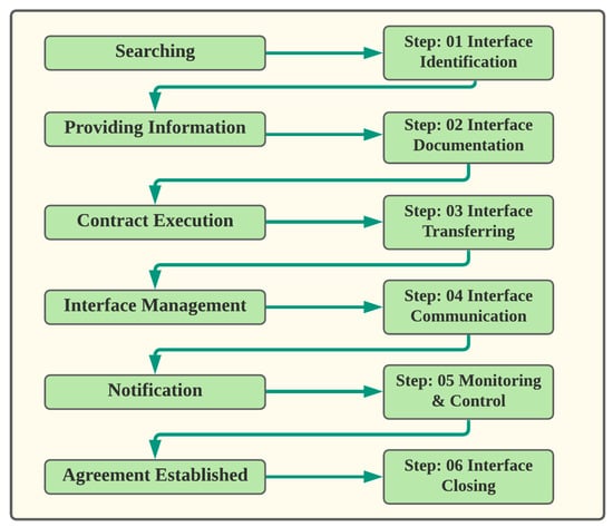In 2014, IMS was defined, within the guidelines of interface and IM, as a combination of managerial and relational communication that can be delivered among two or more interface stakeholders. [43]. It was mentioned earlier that IPs, IAs, and IADs are the elements of IMS. IMS was studied in terms of a six-step framework execution, as shown in the self-explanatory Figure 4.