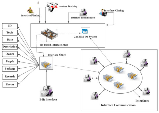 The ConBIM-IM system was proposed to design by constructing IM and IMS. Meanwhile, the 3D-CAD interface represents objects and attributes of interface events—the BIM stores digital interface information to facilitate easy updates and interface transferring. As a result, the 3D interface information can be identified, tracked, managed, and further solved problems. The ConBIM-IM enables participating engineers to share and save all documents in 3D formats, and be available upon future request. Figure 8 details the 3D interface maps framework equipped with the eight components of ID, topic, date, description, owner, people, attachments, and history.