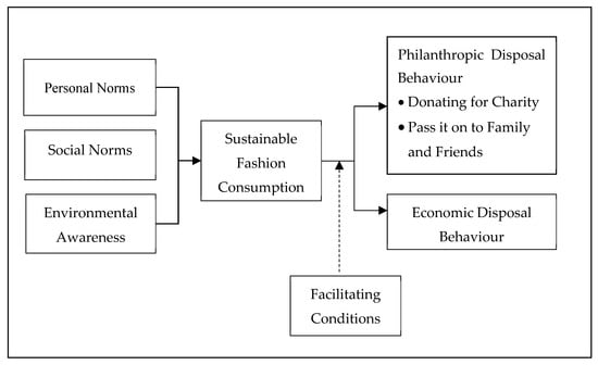 A study has shown that the more favourable the facilitating conditions, the higher the participation rate, whereas insufficient accessibility resulted in a low participation rate, regardless of the consumers’ pro-environmental consumption behaviour of fashion products [49]. Regardless of the levels of habit or intention, facilitating conditions play a critical role in their presence or their absence. In this study, the facilitating conditions function as a moderator towards clothing disposal behaviour. The facilitating condition will moderate a philanthropic behaviour either to give the clothing to charity, family, and friends or to dispose of the clothing for economic reasons. Based on the discussion above, hypotheses H7, H8, and H9 for the moderating effects of facilitating conditions were suggested as follows.