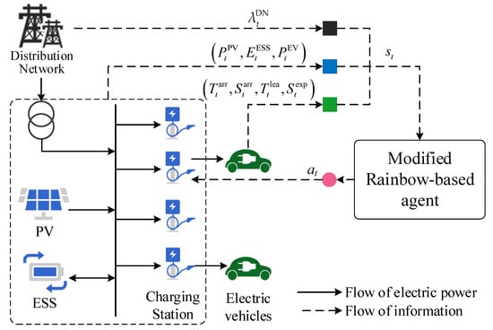 The state is the agent’s perception of the external environment information, and the state space S is the set of environment states. The environment is divided into EV, CS, and DN to capture the comprehensive information accurately. The state is shown in Equation (1).