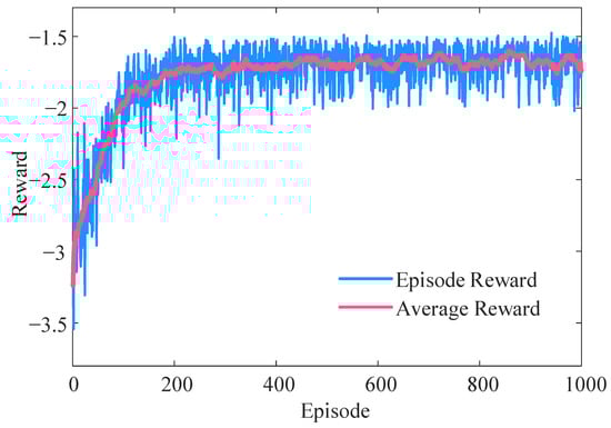 Figure 3 exhibits the rewards of each training episode. Due to the random state of EVs and the PV output in each episode, the rewards obtained by the agent fluctuate significantly. Nevertheless, the rewards show an apparent upward trend in the early training stage and converge from 180 to 210 episodes. The average rewards stabilize at −1.69, indicating that the agent fits the optimal state-action mapping. Note, the agent is encouraged to explore the environment with a significant learning rate in the early training, which leads to the unstable learning ability of agents during 200–400 episodes. In particular, the reward was only −2.35 in episode 287 (the learning rate was set as 0.096). However, the stability of the agent was improved with the increase in training episodes.
