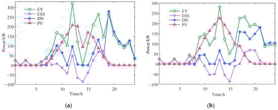 Furthermore, we benchmarked the performance of our method with an uncoordinated policy. Figure 4 details the CS power distribution under the above two methods. It can be seen from Figure 4a that the charging load reached its peak at around 12:00. The ESS, PV, and DN must cooperate in responding to the charging load during this period. However, the charging load dropped sharply at around 14:00. Due to strong light radiation and high temperature, PV output was much greater than the maximum charging power of the ESS, resulting in the PV curtailment, and the PV utilization rate was only 87.40%. Given the depletion of ESS after 19:00, the CS can only rely on the DN for power supply, and the power purchase cost for the whole day reached USD 180.90. As attested by Figure 4b, the PV utilization rate increased to 92.23% after operating the optimal scheduling approach. Moreover, as the charging load during the peak electricity price period was shifted, the dependence on the DN was significantly reduced. The electricity purchase cost was reduced to USD 140.03 (a reduction by 22.59% compared with the benchmark).