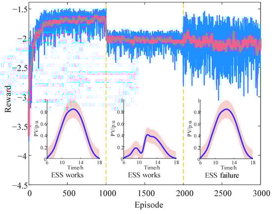 In this part, three experimental scenarios were designed to analyze the generalization performance of the proposed modified rainbow method. The configuration of the three scenarios are as follows: (1) The ESS works under normal conditions on clear days (1–1000 episodes); (2) the ESS works under normal conditions on cloudy days (1001–2000 episodes); (3) the ESS works under failure conditions on clear days (2001–3000 episodes). The total number of training episodes was 3000, and the scenario was changed every 1000 episodes. The training reward can be obtained as shown in Figure 5. The stable average rewards in the three scenarios were −1.69, −2.08, and −2.06, respectively. Owning to the low PV output, the PV curtailment rarely appeared in scenario 2. However, there were significant increases in the power purchase cost, and the reward was reduced by 23.08% compared to scenario 1. The ESS failure brings further uncertainty to scenario 3. The rewards received by the agent fluctuated significantly, and the average reward was reduced by 21.89% compared to scenario 1.