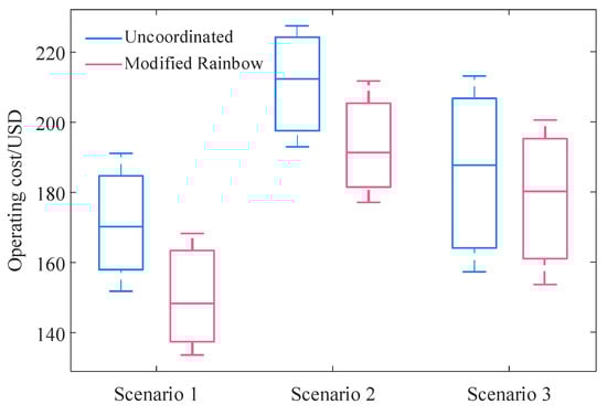 As regards the application performance, the agent trained only in scenario 1 was tested online for 100 episodes in the three scenarios, and the CS operating cost was detailed in Figure 6. As attested, the proposed method effectively reduced the CS cost in the three scenarios. In scenario 1, the average operating cost under the uncoordinated policy was USD 170.80, while under the proposed method it was only USD 149.13. The operating cost in the three scenarios was reduced by an average of 9.72%. In particular, although the operating conditions in scenarios 2 and 3 were not designed during the training process, the CS operating cost was effectively reduced during the test process, showing a strong generalization ability. The proposed method quickly adapts to the current environment and supports the engineering application.