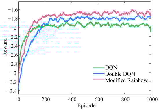 We also benchmarked the enhancement performance of our algorithm with DQN and DDQN solutions. Figure 7 exhibits their training process. Obviously, DQN rises rapidly and tends to converge in 150 episodes. However, as DQN is challenging to solve the complex decision-making problem with high state and action space dimensions, the average reward after convergence was only −1.94. The reward of DDQN was increased by 7.10%, while the sacrifice was the convergence rate. The comprehensive performance of our proposed algorithm was greatly improved. While ensuring the convergence speed, the reward increased by 12.81% compared with the classical DQN solution.