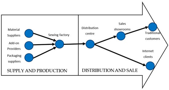 - Milewska, B. Models of supply chains in the garment industry. Transp. Econ. Logistics. Model. Logist. Processes Syst. 2018, 78, 91–102. [Google Scholar] [CrossRef]