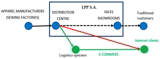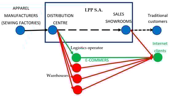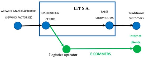 The company also sells clothing to online customers. Before the pandemic, the sales to internet customers were growing slowly but systematically. Deliveries to online customers were handled by a logistics operator specializing in e-commerce, which organized the delivery of clothes to internet customers from its own warehouse. Traditional distribution and e-commerce at LPP S.A. before the pandemic is shown in Figure 5.