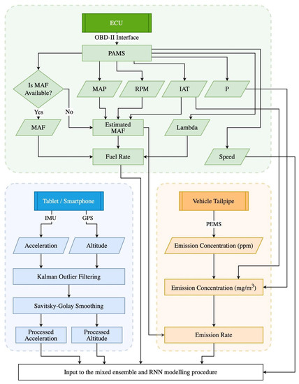 The test fleet for on-road experiments included 35 different passenger cars from three cities of Montreal (Canada), Bucaramanga (Colombia), and Tehran (Iran). On-Board Diagnostics (OBD) loggers installed on the vehicles collected the engine-state parameters. Instantaneous GPS coordinates and accelerometer measurements were logged simultaneously. The OBD parameter set included RPM, Manifold Absolute Pressure (MAP), Mass Air Flow (MAF), Barometric Pressure (P), Fuel-Air Equivalence ratio (), and Intake Air Temperature (IAT). A state-of-the-technology Portable Emissions Measurement System (PEMS) was installed on the tailpipe of vehicles under study in Montreal to monitor and log the instantaneous CO2, PM, Nitrogen Monoxide (NO), and Nitrogen Dioxide (NO2) concentrations.