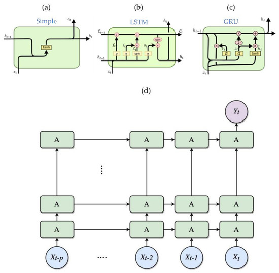 The (a) Simple, (b) LSTM, and (c) GRU structures of RNN cells as well as a (d) stacked many-to-one RNN architecture with lag order of p (RNN cells shown in green color).