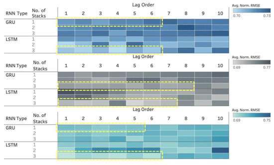 The diversity of lag sources makes the true order of lag completely unknown and possibly dynamic. To deal with this uncertainty, we performed a grid search and trained RNN models for all the vehicle-dependent pairs with different cell structures, architecture depth (stacking), and lag orders ranging from 1 to 10 (the dependents are the FCR and ERs). The upper bound for the lag-order range was selected based on an engineering judgment and the notion that 10 s is long enough for dissipation of temporally distributed effects in vehicles’ physical operation. Figure 5 visually represents the average of normalized Root Mean Squared Error (RMSE) for the trained models. Note that the color in each cell reflects the average modeling score (ranging from 0 to 1) for the whole fleet under study, not a subset of vehicles.
