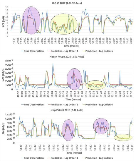 The results of RNN modeling for lag orders of 1 and 6 for a randomly selected time-window for three of the vehicles under study are presented in Figure 6.