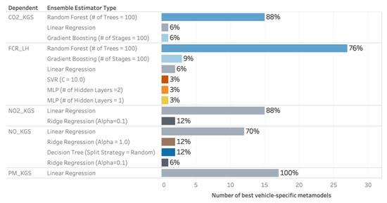The primary metamodels will be used later for building higher-level ensembles for the categories of vehicles. Note that the modeling approach taken here is inspired by the Stacking method in the EL paradigm, where the component models are trained based on a complete dataset, and then their outputs are used as input variables to train an ensemble function (shown in Figure 7).