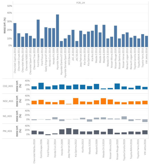 Taking a look at the RMSE scores of the ensemble category-specific supermodels, all positive score improvements with rare zero values are achieved. This supports the idea that EL algorithms could work as a unifying medium for developing higher-level (aggregate) microscale fuel and emission models. Transmission Type seems to be the most efficient aggregation measure for FCR supermodels. The transmission system directly deals with the quality of power transmission from the engine to the wheels and has a significant impact on the efficiency of the combustion process. Hence, its importance regarding fuel consumption and CO2 generation is expectable. However, this criterion does not seem appropriate for NO and PM emissions where limited improvements is achieved.