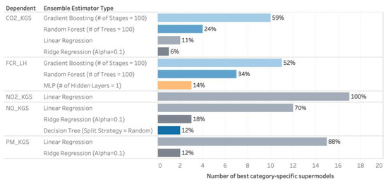 Figure 14 shows that even for the supermodels, sophisticated algorithms (Gradient Boosting as well as Random Forest) outperform others for the majority of criteria/categories for FCR and CO2 rate, while similar to the metamodels, Linear and Ridge Regressions shoulder the forecast combination burden of NOx and PM supermodels better.