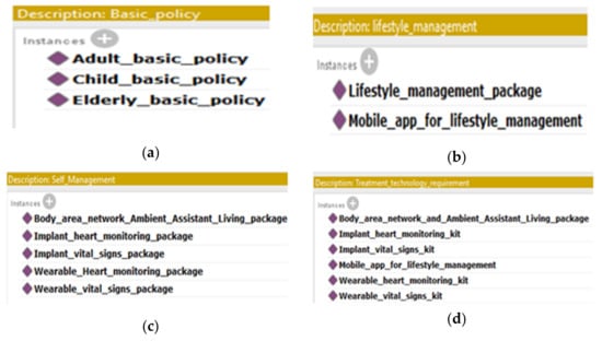 - Sub-class: Basic_policy—provides packages for customers with a “Healthy” health status. Figure 5a presents instances of the “Basic_policy”;