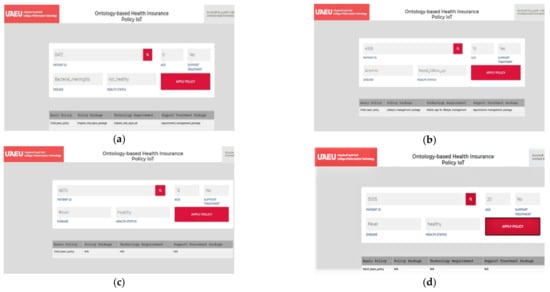 Shen et al. [13] proposed a clinical support system as first-line therapy for diagnosing infections and prescribing an appropriate antibiotic. The reasoning process depends on data entered by the patient, including body temperature, symptoms, complications, antibacterial spectrum, contraindications, and drug–drug interactions. This proposed infection ontology was considered a complete ontology, as compared to other existing ones at the time. Applying Internet of Things (IoT) technology-based devices and protocols in data collection can enhance the quality of collected data and the accuracy of results. Hristoskova et al. [14] proposed an IoT-based ontology system to monitor the real-time data of congestive heart failure patients only. In emergency cases, the system alerts the specialized physician, while considering the physician’s location. However, the approach was validated on a medical emergency scenario and was limited to congestive heart failure patients. Abbas et al. [15] proposed an ontology-based system that recommended a suitable insurance plan based on users’ data entries. The user enters the required information and the system applies an XML retrieval approach to recommend the best policy. The system considers the policy price, the policy coverage, and benefits, while selecting the customer policy and using market standard policies.