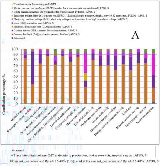 The LCA of the other raw materials used in the production of biocementitious materials revealed that Ca (NO3)2·4H2O contributes by 58.885% to ozone depletion, 6.569% to global warming, 4.191% to human health through ozone formation, 6.567% to fine matter formatter, 4.42% to the effects of terrestrial ecosystems through ozone formation, 9.53% to terrestrial acidification, 12.102% to terrestrial ecotoxicity effects, 19.348% to marine ecotoxicity, 26.527 to human carcinogenic toxicity, 25.27 in land use, 3.191% in freshwater eutrophication, and 11.768% to marine eutrophication. Urea contributes 38.1538% in marine eutrophication, 5.9118% in global warming, 6.3191% in ionization radiation, 5.1307% in human health through ozone formation, 9.5344% in fine particular matter formatter, 5.3107% in terrestrial ecosystem effects through ozone formation, 7.9307% in terrestrial acidification, 6.5829% in terrestrial ecotoxicity effects, 7.0593% in marine ecotoxicity, 8.1824% in human carcinogenic toxicity, 6.643 in land use, and 4.2556% in freshwater eutrophication. Molasses contributes by 13.779% to marine eutrophication, while molasses has no role in the effects on other parameters. The high concentration of urea discharged from wastewater generated from the cleaning of equipment used in biocement production is associated with the occurrence of harmful algae blooms due to eutrophication in the natural water system [28]. Molasses effectively contributes to the diversity of marine life due to the absorption of oxygen in water by liquid sugar. Molasses also contributes to the appearance of algae blooms and the growth of pathogenic bacteria [29].
