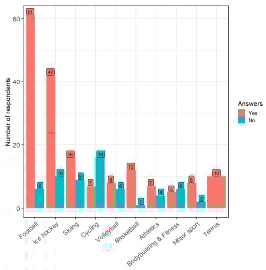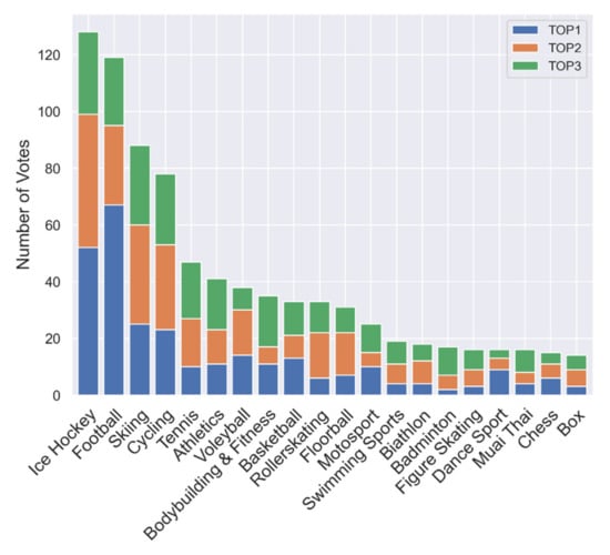 Within the aggregated responses, ice hockey was the most popular sport type. However, European football (in Figure 1 and further in the text referred to as football) reached more responses in the TOP 1 category (67) compared to ice hockey (52). On the other hand, this phenomenon is aligned with the theoretical premises arguing that significant international success increases the sport’s popularity. Petra Vlhová won the downhill skiing World Cup in the month when the survey was conducted, which could have influenced the survey’s results. The fourth most popular sport type was cycling. In this case, the relatively high popularity may be explained by the long-term success of Peter Sagan, who popularized the sport of cycling in Slovakia with his achievements. The fifth place in overall popularity was taken by tennis (with the majority of TOP 2 and TOP 3 occurrences), followed by athletics, volleyball, bodybuilding and fitness, and basketball. The top ten sports were completed by roller skating, which had the largest representation in the TOP 2 category. Roller skating appeared in the top ten in connection to the instructions given to respondents to express their subjective feelings. Specifically, the dimensions of practicing and watching the sports may have been intertwined in their minds. The results could also have been affected by the fact that, at the time of the survey, a lockdown was in force and many sports facilities in the country were closed for this reason.