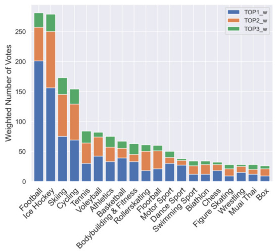 To account for the level of popularity of the individual sports, weights were applied to the results, where the TOP 1 occurrences were multiplied by three (new variable TOP 1_w), the TOP 2 occurrences were multiplied by two (new variable TOP 2_w), and the TOP 3 occurrences were left the same (or multiplied by one; new variable TOP 3_w). The results were reordered according to the sum of the responses considered. The first twenty sports are shown in the following stacked graph (Figure 2).