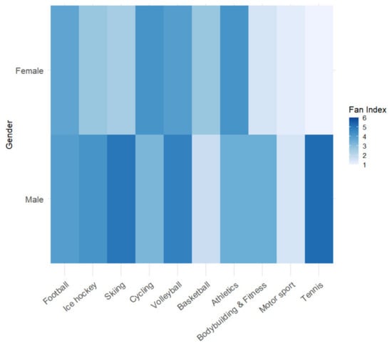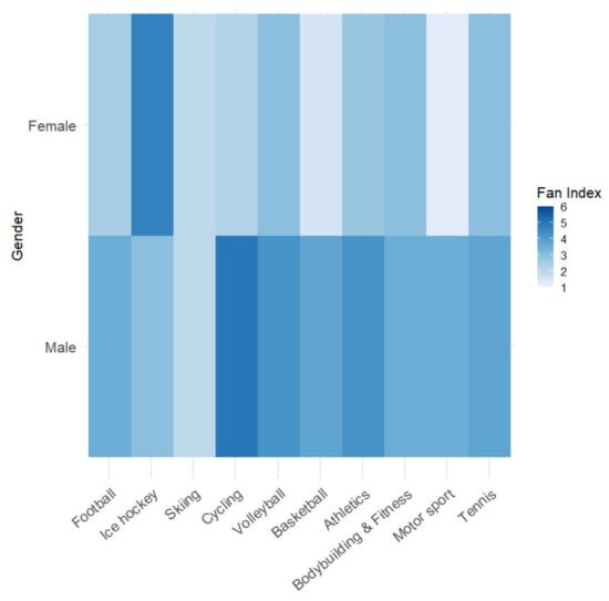 The next level of analysis was a heat map with three variables, where a fan index was added to the relationship between gender and sports (Figure 4). The findings created a bridge towards the H2 hypothesis in which the factor of gender is studied and the H4 hypothesis using the fan index as a variable. This was created as an artificial variable, calculated by averaging four variables on a scale of 1 to 6 (1—never/not at all; 6—always/very often). All the embedded variables were gained from the questions describing a theoretically justified fan behavior, for example: “How often do you think about your favorite sport/sports team/athlete?”; “How often do you feel emotions when consuming sports products?”; “How often do you buy sports merchandise?”; and “How often do you buy tickets to live sports events of your favorite sports?”. Thus, the fan index variable represents the fan level on a scale from 1 to 6, where 6 represents strong fan behavior. The heatmap shows stronger fan behavior in a darker color.