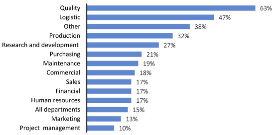 The departments where the implementation of the Lean methodology is more expressive are Quality (63%) and Logistics (47%), while the Project Management department (10%) is the less experienced. In the middle, one can find Production (32%), Research and Development (27%), Maintenance (19%), Commercial (18%), and Financial (17%), among others (Figure 1).