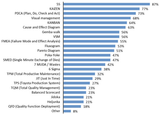 The 5S tool continues to lead the preferences of the companies, with 87%, similar to what occurred in 2011, when it was the preference of 88.6% of Lean companies [35]. Kaizen was the second option with the highest number of responses; it had an increase from 62.9% to 77% since 2011 [35]. This shows that Kaizen has been progressively used in companies operating in Portugal. The PDCA cycle is the following choice, with 73% of respondents claiming to use it in their companies. In another study carried out by students on Industrial Management and Engineering Master in ISEP – School of Engineering, Polytechnic of Porto, Portugal, between 2001 and 2010, in a small sample of 18 companies, 20 Lean tools were identified as being used in industrial projects, with Kanban as the main choice [46]. Finally, the application of Quality Function Deployment (QFD) was chosen by 18% of respondents. It is also verified that 8% of the companies indicate “Other”, which may suggest the existence of other tools created by the companies themselves (Figure 2).