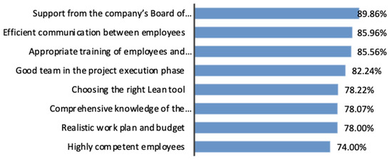 Respondents expressed their opinion about the important factors influencing the success of Lean implementation in the company they worked for. They rated each item on a Likert-type scale, where 1 meant a minor factor and 6 meant a high importance factor. A classification score was assigned to each item. This score represents the proportion between the number of points obtained in a given item and the maximum they could obtain (Equation (1)). Figure 3 shows the scores obtained by each item.