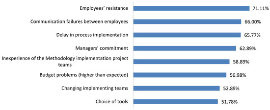 In the dissertation by Moreira [35], the main factor preventing the introduction of Lean was the Financial Resources of the company, with 45.1%. In the current study, this factor has registered a significant decrease to 3%. In the same study, the factor with the highest percentage of responses was Top Management, with 39.2%. This result is in line with the current study, which supports the idea that the greatest effort for change will have to come from the Company Management.