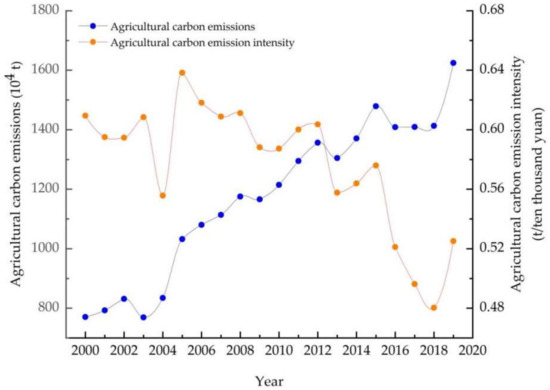 Agricultural carbon emissions and agricultural carbon emission intensity (CI) in Henan Province during 2000–2019.