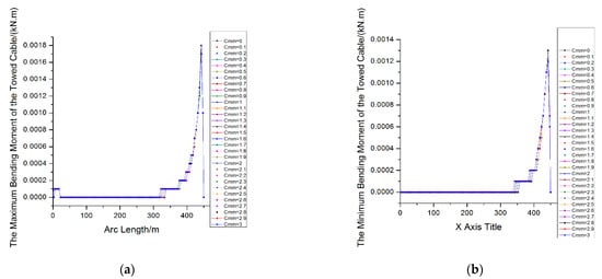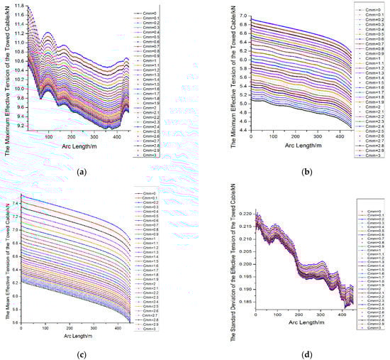 - The amplitude of the maximum effective tension under the action of a certain single Munk moment coefficient has a tendency of recurrent fluctuations along the length direction. The coordination and synchronization of the effective tension of the towing cable may be better than that when there is no Munk moment; when the Munk moment coefficient is 0.5–0.9, the effective tension of the towing cable has almost the same synchronism along the length direction; with the increase in the Munk moment coefficients, the synchronism of the tension of the towing cable firstly decrease and then increase.