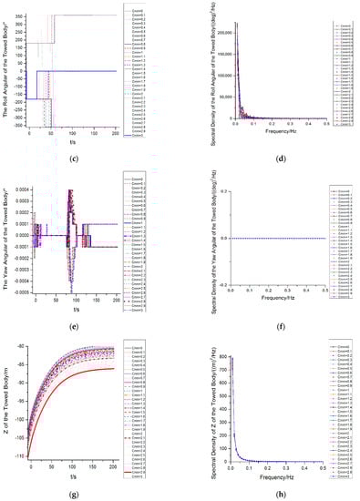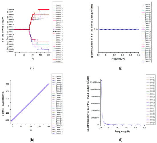 - With the increase in the Munk moment coefficient, the pitching angle of the towed body in the stable state increases successively and eventually approaches a certain stable value with the increase in the Munk coefficient. The pitching and roll of the towed body interact with each other; the time turning point of the roll angle into the steady state is in advance of the increase in the Munk moment coefficient in proper sequence; under different Munk moment coefficients, the roll angle of the towed body is basically maintained at three values when the towing attitude of the towed body is basically stable. The Munk moment has little effect on the yaw angle, the yaw angle of the towed body will not fluctuate with the change of the external frequency in the frequency domain, and no low-frequency response will occur.