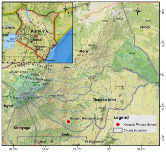 We conducted the soil GHG quantification experiment at Kangutu Primary School (1468 m, 00°98′ S, 37°08′ E) farm in Tharaka-Nithi County, Kenya (Figure 1). Kangutu Primary is in the Upper Midland two, agro-ecological zone [22]. The county has two rainy seasons, March to May (long rains) and October to December (short rains), with a minimum of 1200 mm and a maximum of 1400 mm annually. The annual temperature of the site ranges from 19.2 to 20.6 °C, having a mean of 20 °C annually. The soils are humic Nitisols, which are well-drained, extremely deep, dusky red to friable clay, with humic A horizon [22]. A recent study by [17] has reported that these soils have low organic carbon (<2.0%), nitrogen (<20 ppm) and are moderately acidic (pH 4.8), therefore requiring amendments to improve and sustain their fertility.