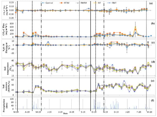 Soil (a) methane (CH4-C mg m−2 h−1), (b) carbon dioxide (CO2-C mg m−2 h−1), and (c) nitrous oxide (N2O-N µg m−2 h−1) fluxes. (d) Soil temperature (°C). (e) Soil moisture (water-filled pore space (WFPS) (%). (f) Precipitation (mm). Treatments: CtC: control (no external input), Mf: sole mineral fertilizer (120 kg N ha−1 yr−1), RMf: maize residue (10 t ha−1 yr−1) + mineral fertilizer (120 kg N ha−1 yr−1), RMfM: maize residue (10 t ha−1 yr−1) + mineral fertilizer (60 kg N ha−1 yr−1) + goat manure (60 kg N ha−1 yr−1) and RTiM: maize residue(10 t ha−1 yr−1) + Tithonia diversifolia (60 kg N ha−1 yr−1) + goat manure (60 kg N ha−1 yr−1). The perpendicular lines are the preparation of land and addition of manure (continuous), planting (medium-dash dotted line), maize residue addition (long-dashed line) and harvesting (short-dash dotted line).