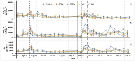 We observed peak ammonium of 17,600 g N ha−1 on 23rd of April 2019 under RTiM treatment and 16,732 g N ha−1 on 10th of October 2019 under Mf, following inputs application and rainfall events. During the study period, the soil ammonium ranged between 546 to 17,600 g N ha−1 (Figure 3a). The soil nitrate ranged between 3822 for under CtC treatment and 46560 g N ha−1 for RTiM treatment during the experimental period (Figure 3b). In addition, we observed occasional peaks in inorganic nitrogen during the study period, such as 51,200 g N ha−1 on 23rd of April 2019 and 50,960 g N ha −1 on 27th of October 2019 following precipitation events (Figure 3c). The inorganic nitrogen was 29% ammonium and 71% nitrate.