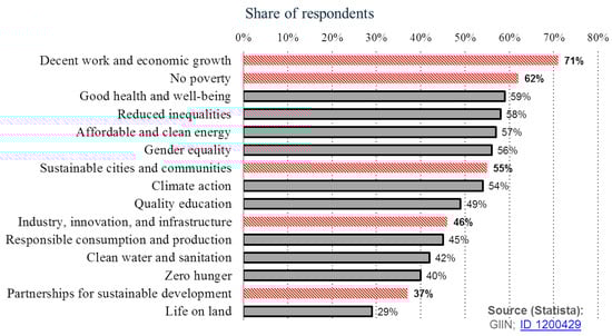 Sustainable development goal (SDG) themes targeted by impact investors worldwide in 2020, according to GIIN (accessed on 10 December 2021).
