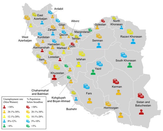 Not only does Iran suffer from unfair distribution and wealth, but there is no strong will at the level of the Government and Islamic Parliament to deal with such a crisis in the current capitalistic system [44,45]. In this kind of atmosphere, the potential ecosystem is appropriately provided to pay attention to strategic forms of CSR [44] and invest to solve social challenges. Among the challenges outlined in Figure 1 are poverty, unemployment problems, and sustainable societies. Figure 2 shows the extent to which the provinces of Iran are involved in poverty and unemployment. This research aims to create a model to address these challenges, although it should not be overlooked that the existing infrastructure in these geographical areas is crucial. Some provinces (such as Sistan and Baluchestan) suffer from extreme poverty and unemployment, but on the other hand, there is no infrastructure to outsource products to companies in this province.