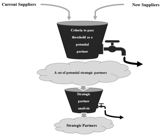 Although the traditional and repetitive criteria such as cost, quality, and delivery time are considered vital criteria in most studies [62], they are not enough to build trust and commitment between the buyer and the supplier to create a long-term communication plan. In this regard, the Spekman model [21] offered two main steps for selecting suppliers: first, collecting complete information based on different criteria from current, domestic, and foreign suppliers and sieving them to create a cluster of potential suppliers for a strategic partnership; second, reviewing and analyzing the strategic partnership to select the leading partner to form a long-term relationship with (Figure 4).
