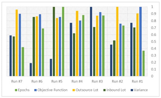 Moreover, in Figure 6, after normalizing the numbers, it is shown what differences among each implementation of the algorithm (due to its different settings) have been made. As illustrated, Run #6 shows a good situation in all cases, which means the more it tends to be minimum, the more efficiency is obtained. It should be noted that an index called variance has been added to the chart that shows the distribution of purchases among suppliers.
