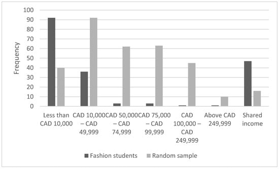 Furthermore, the income distribution in the sample is presented in Figure 2. To compare the two samples, we conducted a Chi2 test. While the result suggests that the Ontario sample represented all income levels, the high-income levels above CAD 75,000 were about five times as high as Statistics Canada’s. (The sample had 30.8 percent above an income of CAD 75,000 while the province has 5.6 percent [,]). A Chi2 test indicates that the fashion students have a lower income than the random Ontario sample (p < 0.0001, Chi2 = 228.69).