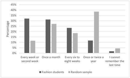The distribution of the question, “How often do you shop for clothes?” split by the random sample and the fashion students is presented in Figure 3.