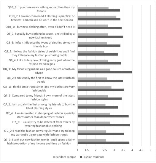 The average for the different components of the fashion index split by the random sample and the fashion students is presented in Figure 4. The figure suggests a higher value for fashion students than for the random sample for every question.