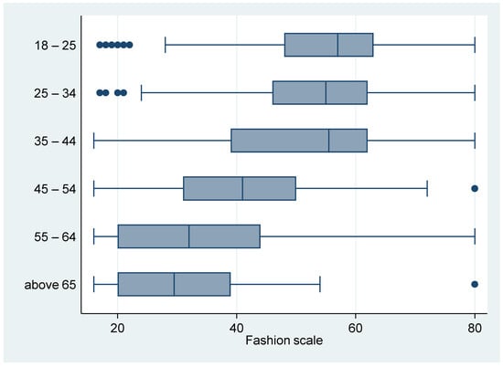 Furthermore, we present the fashion scale results split by age group (see Figure 5). The results demonstrate that 18–25-year-old respondents have the highest fashion interest, followed by the 35–44-year-old range. There is a decreasing trend in fashion interest after 45, and fashion interest is lowest after 65.