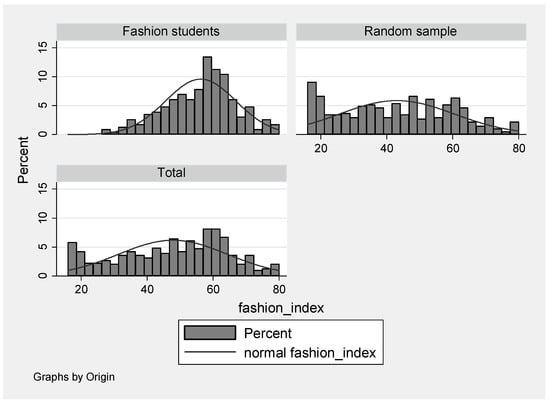 The fashion scale distribution of the fashion students against the random sample is presented in Figure 7. The results suggest that the random sample is skewed to the right, while the fashion students’ sample is skewed to the left and that fashion students have a higher index than the random sample.