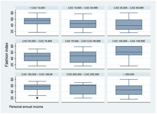 Furthermore, we present the box plots for the fashion index split by income (see Figure 8). The highest fashion index value can be found in the income group between CAD 100,000–CAD 149,000. The results suggest that the fashion index is different for income groups but does not linearly increase with income.
